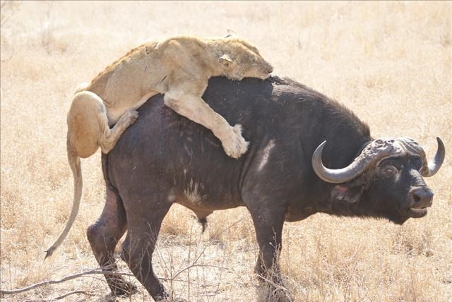 Вскоре стало понятно, что лев вместе с сородичами гнался за буйволом. «Мы были шокированы, когда буйвол подбежал прямо к нашей машине», — признается Тонкин. «Лев погнался за самцом буйвола совершенно внезапно. Они пересекли дорогу прямо перед нами, и мы с удивлением наблюдали за ходом битвы, — говорит Коулман. — Две львицы, которые были возле своих детенышей, присоединились к погоне за буйволом».