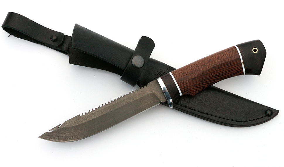 Необходимо отметить, что охотничьи ножи с рукоятями из древесины наиболее распространены, хотя на данный момент большое количество ножей производится с полимерными рукоятками. На взгляд автора, самый универсальный сорт дерева для рукояти ножа является дерево Венге. Это африканское тропическое дерево, обладающее ценной древесиной, которая устойчива к механическим нагрузкам, а так же всякого рода грибкам и насекомым. Для ножевого производства, очень важны следующие свойства Венге – плотность и текстура.