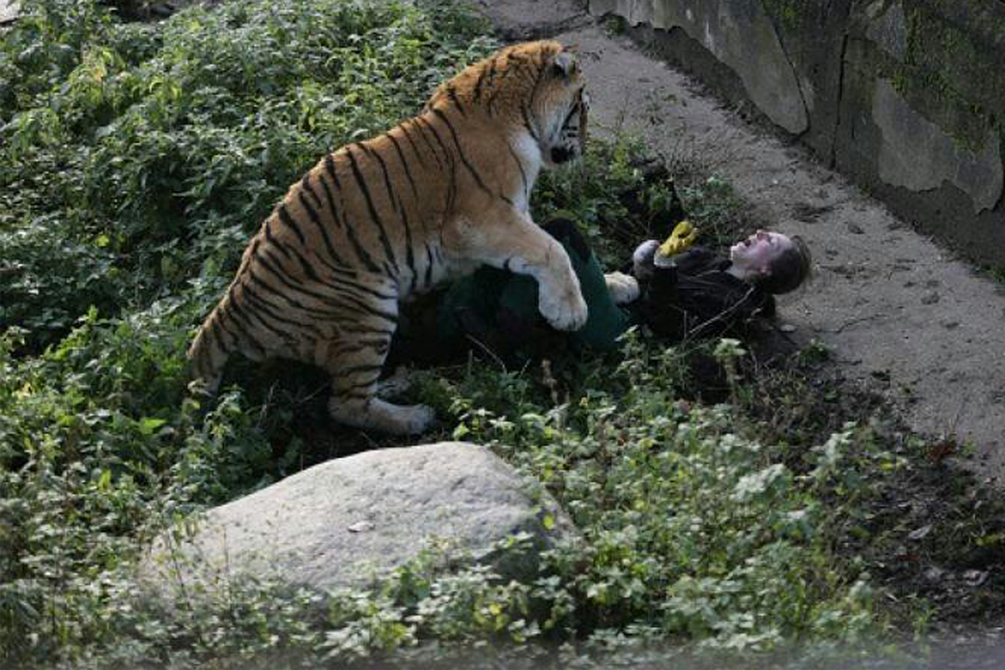 Настоящая жесть из Индии. Особенно эпичен прыжок тигра и его рев. При этом смешно, что мужчина пытался защититься деревянной палкой. Конец ролика показывает, что товарищ выжил, но с рукой все очень плохо.